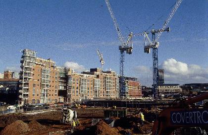 Wide view of canalside appartments being constructed in Ladywood