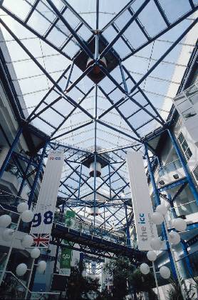 View up into roof of ICC with G8 hanging banners