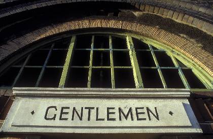 Gentelmen's Toilet sign above toilets in railway arches at Lawden Road