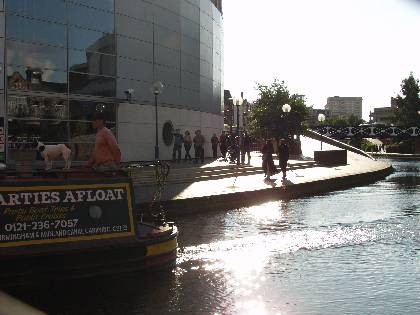 Canal narrow boat behind Sealife centre with pilot & dog on board