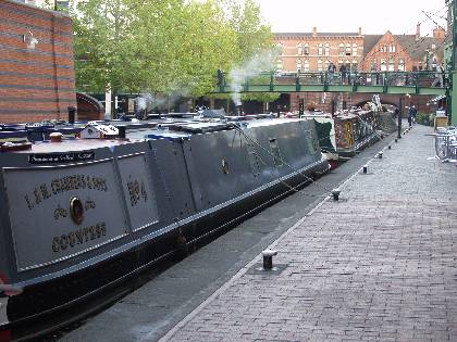 Description: Narrow boats moared up alongside Brindley Place