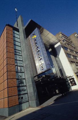 Description: Exterior oblique perspective view of Hippodrome theatre from south