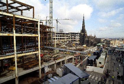 Construction workers on St Martins Sq during construction of Bullring