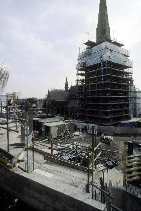 St Martins clad in scaffold during cleaning work with Bullring construction
