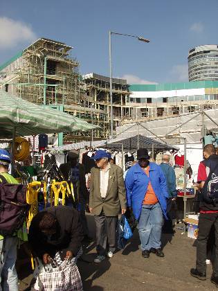 Description: Outdoor market shoppers with backdrop of Bullring construction