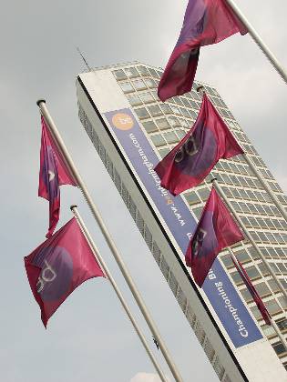 Alpha Tower viewed through flags beinbirmingham banner on building side