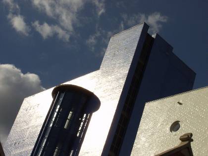 Feature of tilled wall of Custard Factory shimmering in sunlight