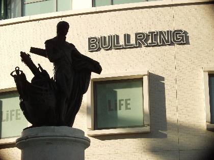 Bullring face detail with Nelson statue in silhouette